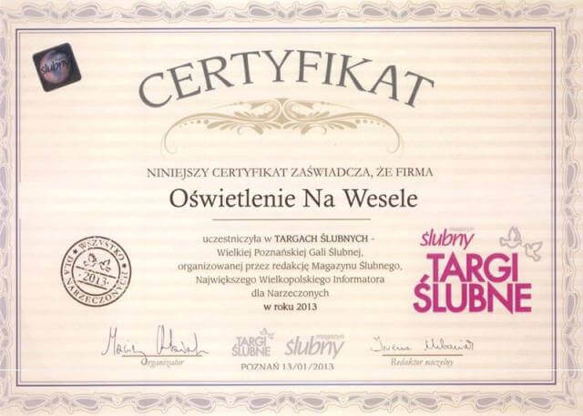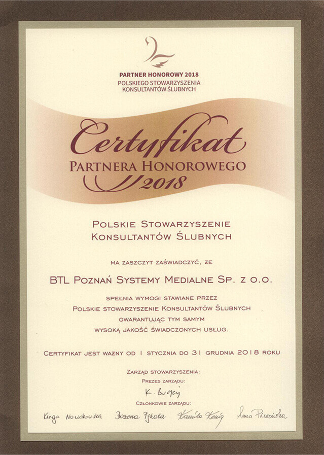 Uhonorowaniem naszego profesjonalizmu jest Certyfikat przyznany nam przez Polskie Stowarzyszenie Konsultantów Ślubnych